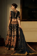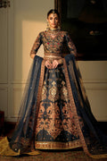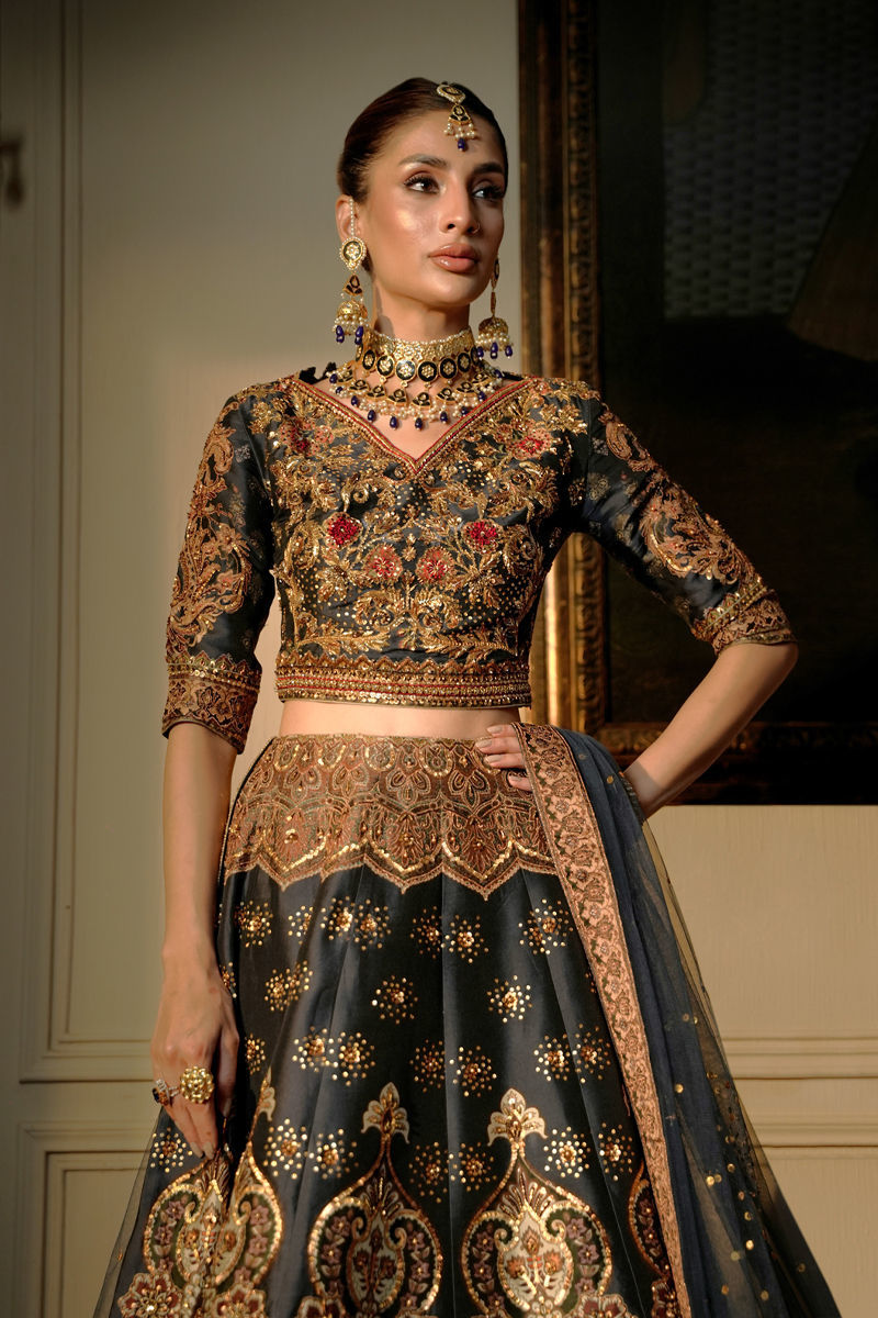 This outfit is a majestic, heavily embellished traditional bridal or formal attire with a royal aesthetic. A deep navy blue lehenga choli set featuring intricate embroidery and regal patterns. Choli blouse is deep V-neckline with structured shoulders elbow-length sleeves richly adorned with heavy handwork. Embroidery in vibrant tones of gold, copper, and maroon for a luxurious contrast. Lehenga is full-flared silhouette with ornate Mughal-inspired motifs in shimmering metallic threads embellished borders in gold for added grandeur. Dupatta is sheer navy net with delicate gold sequins scattered across and finished with an elaborately embroidered golden border, adding opulence to the overall look. A luxurious, heritage-inspired bridal outfit that radiates royal sophistication, perfect for weddings, receptions, or grand festive occasions.