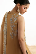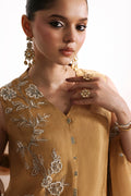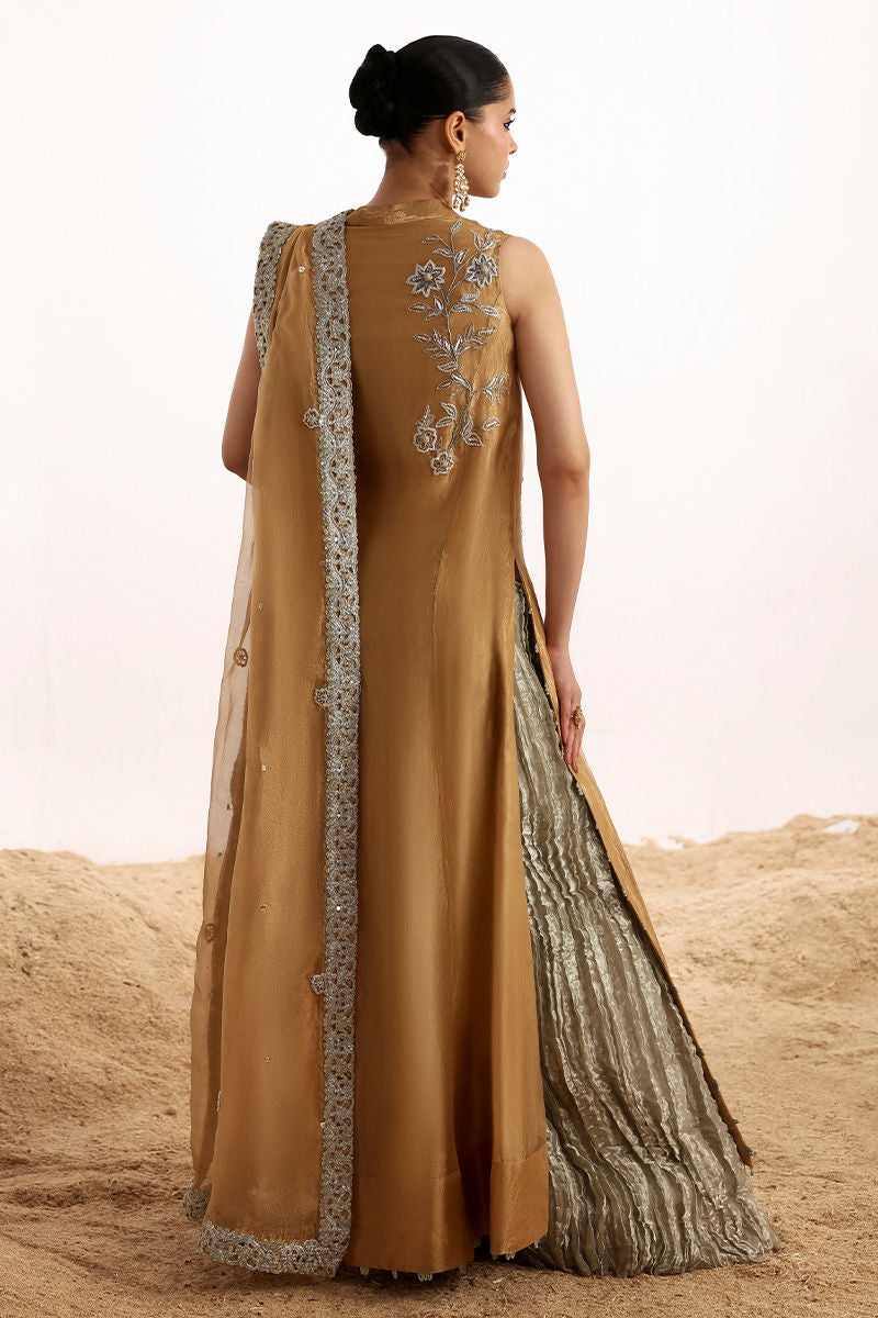 A regal Golden Indian Tissue ensemble featuring a finely crafted shirt with a matching dupatta and a graceful tissue sharara. A luxurious design that radiates timeless charm.